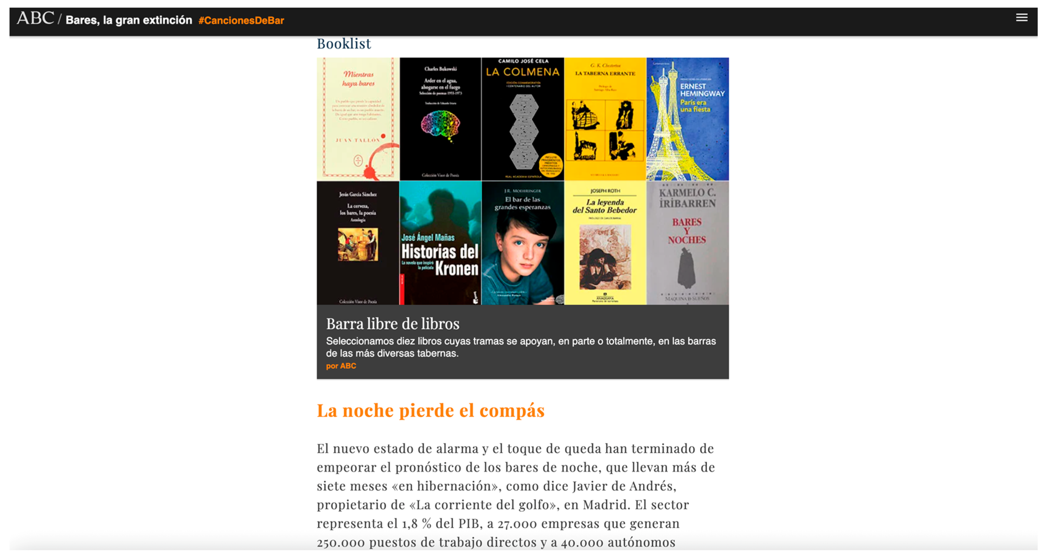 F.3. Elements | Text Image Infographics | Text Photographs Audiovisual reports Podcast Music playlist Booklist—Selection of 10 books centered on the bars of different taverns. Other short stories (Ex: “It’s the same construction disaster of a decade ago”—ABC.es by Érika Montañés) | Text Photographic slides Immersive—360º image | Text Infographics Animations Links |