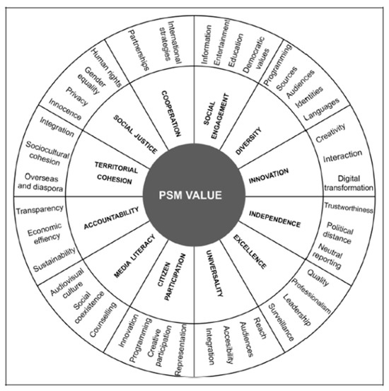 2022), which identifies twelve key dimensions: universality, quality, independence, diversity, accountability, innovation, social commitment, citizen participation, media literacy, territorial cohesion, social justice, and cooperation, along with their corresponding sub-indicators.