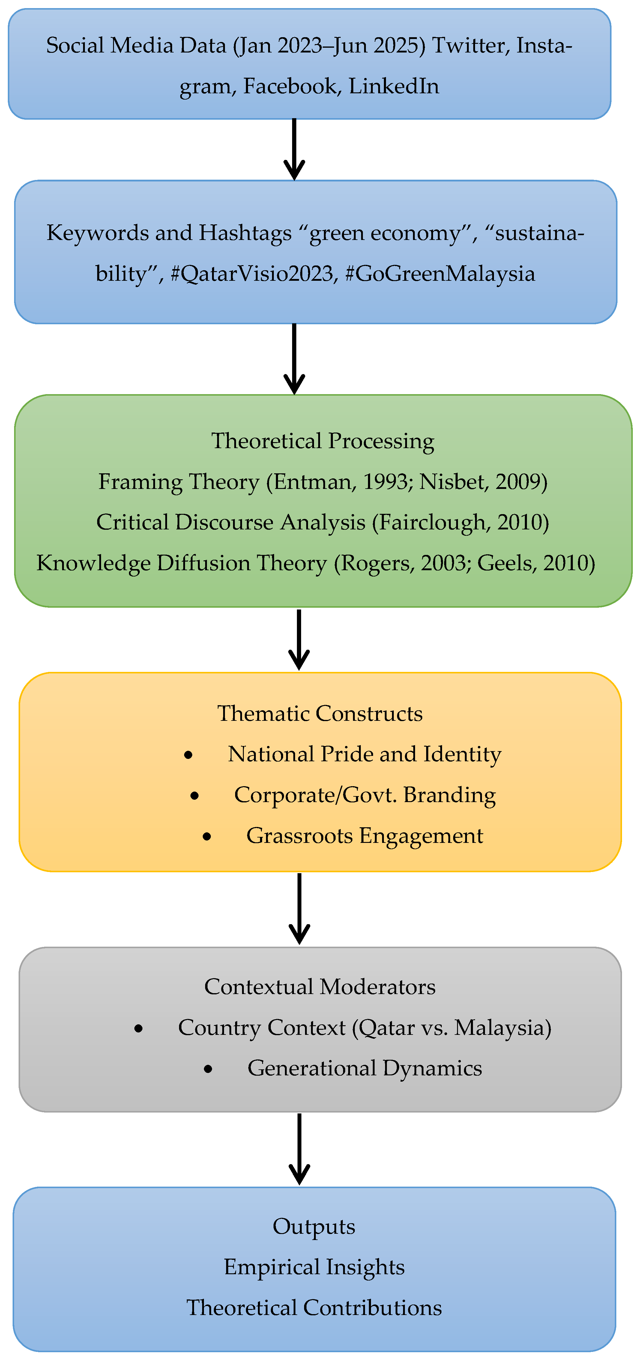 - Knowledge Diffusion Theory (Rogers, 2003; Geels, 2010)—assessing how sustainability narratives spread, gain legitimacy, and face resistance in different socio-political contexts.