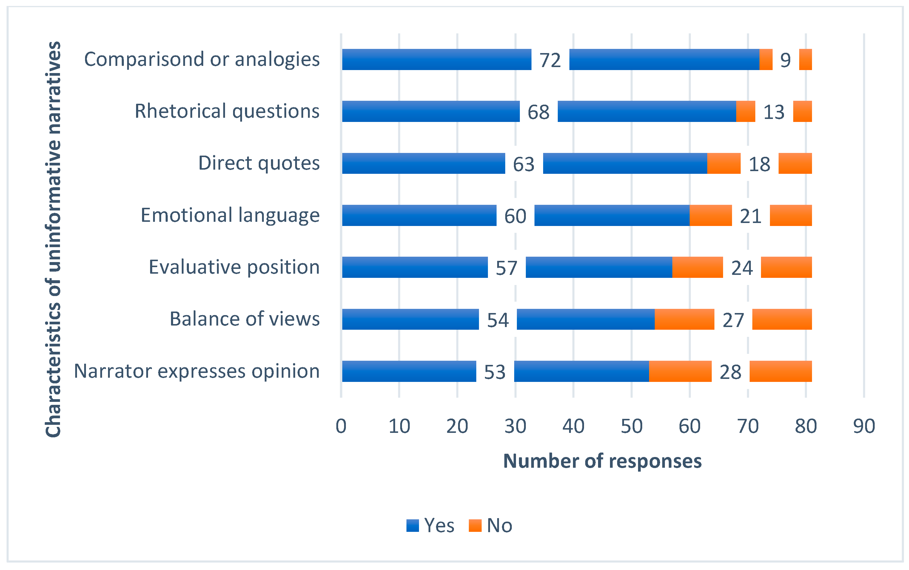 Figure 1) indicate that respondents identify characteristics of disinformative narratives, mostly analogies, rhetorical questions and indirect quotations.