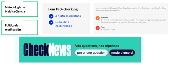 The fact-checkers’ fervour regarding the transparency of sources was not reflected in the other two parameters: access to methodology was 26.3%, while access to corrections was 19.6%. Six outlets break this generic trend: CheckNews (100%), CORRECTIV (100%), Reuters (100%), Verificat (100%), Maldita (86%), and Newtral (41%). Meanwhile, independent fact-checkers’ involvement in fulfilling these parameters was found to be greater: access to methodology was 32.5%, and access to corrections was 25.6%. Among legacy media fact-checkers, the percentages were lower, at 16.9% and 17.9%, respectively. Figure 3 shows examples of access banners to methodology in some sample outlets.