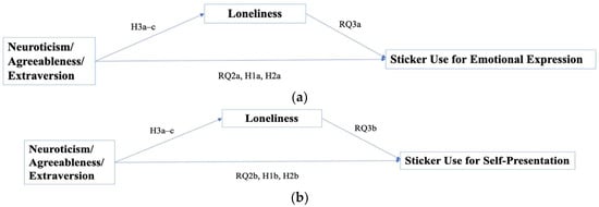 The Conceptual Models. (a) Predictors of Sticker Use for Emotional Expression; (b) Predictors of Sticker Use for Self-Presentation.
