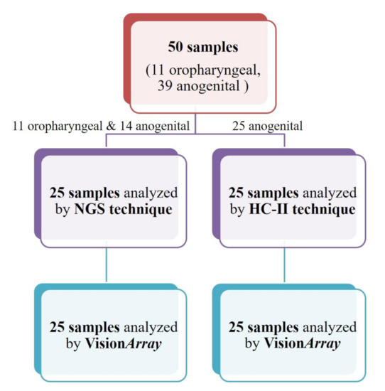 In the present study, we analyzed 50 samples from anogenital and oropharyngeal lesions. Of these 50 samples, 25 were tested using both next generation sequencing and the VisionArray® HPV Kit and the other 25 were tested with the Hybrid Capture® 2 High-Risk HPV DNA Test and the VisionArray® HPV Kit.