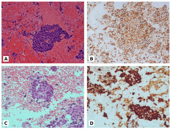 The PD-L1 expression was evaluated on cell block sections using TPS, which is defined as the percentage of viable tumor cells with partial or complete membrane staining of any intensity (≥1+), relative to all viable tumor cells in the examined section (positive and negative). The presence of at least 100 viable tumor cells was necessary for evaluation (Figure 1).