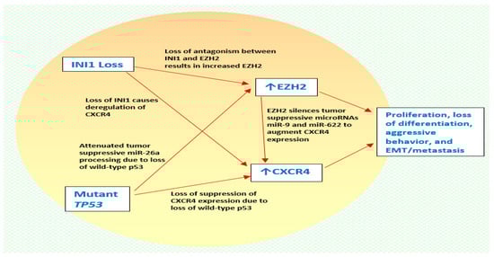 The graphical illustration of the INI1, EZH2, CXCR4, and mutant TP53 interaction.