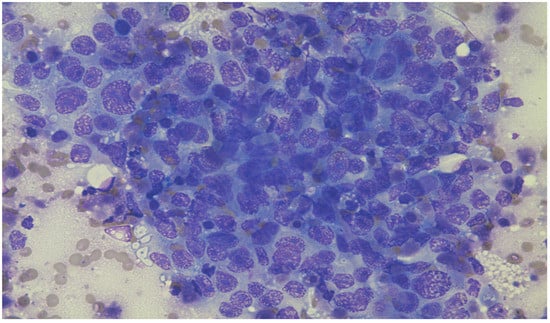DiffQuick, 200X. The touch preparation of the ultrasound-guided fine-needle aspiration and biopsy of one of the liver lesions showing sheets of malignant epithelioid cells with a high nuclear-to-cytoplasmic ratio.