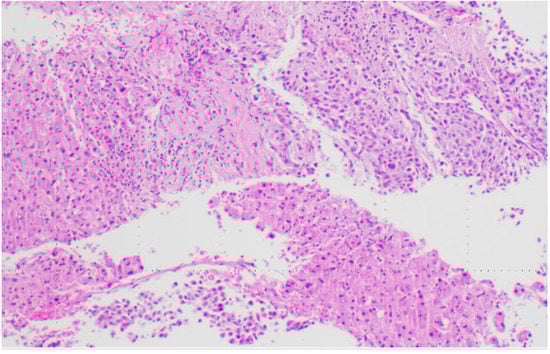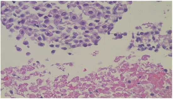 H&E, 100X. Ultrasound-guided fine-needle aspiration and biopsy of one of the liver lesions with sheets of malignant epithelioid cells.