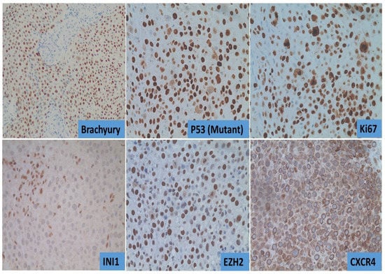The main author already knew about the antagonism between the SNI/SWF (which contains INI1) and EZH2 [], and the ramifications of a p53 mutation, including the induction of EZH2 expression due to the loss of the processing of miR-26a [] and the loss of the negative regulation of CXCR4 by p53 in its wild-type form []. Therefore, we set out to correlate the immunohistochemical findings with the genomic findings to test our theory that these markers of aggressive behavior (namely, EZH2 and CXCR4) would be upregulated in the patient’s tumor due to the identified genomic alterations. Unstained sections prepared from the cell-block material of the patient’s liver biopsy were used. The formalin-fixed paraffin-embedded (FFPE) tissue was stained with antibodies anti-p53 (DO-7) primary antibody (Ventana®, Oro Valley, AZ, USA), anti-Brachyury/Bry antibody [EPR18113] (Abcam®, Cambridge, UK), anti-SNF5/SMARCB1 antibody [ERP20189] (Abcam®), anti-CXCR4 antibody [UMB2] (Abcam®), and anti-EZH antibody (Cell Signaling Technology®, Danvers, MA, USA). Protocol was followed as per the insert for each antibody. The anti-p53 (DO-7) primary antibody (Ventana®) is a prediluted mouse monoclonal antibody, in which the cell conditioning 1 standard (CC1) is used for the antigen unmasking, alongside a VIEW DAB detection kit. The anti-Brachyury/Bry antibody [EPR18113], anti-SNF5/SMARB1 [ERP20189] (dilution 1:400), and anti-CXCR4 antibody [UMB2] (dilution 1:100) (all Abcam®) are rabbit monoclonal antibodies, in which heat-mediated antigen retrieval with Tris/EDTA buffer pH 9.0 and a mouse HRP polymer detection kit is utilized. The same goes for anti-EZH antibody (Cell Signaling Technology®) (dilution 1:100), but with EDTA buffer pH 8.0. Slides were then examined by bright-field microscopy to assess the staining intensity for each immunohistochemical marker. The results are discussed below.