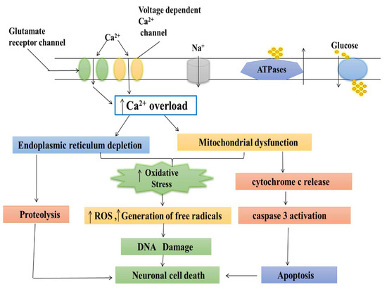 The calcium was accumulated in the mitochondria neuron, resulting in the mitochondrial calcium uptake, sequestration, and release of the calcium-dependent responses that resulted in gene transcription and cell death [83,84]. The stimuli were activated by initiating the entry of (Ca2+) through plasma membrane channels and responded by neurons. However, the increase in free cytosolic (Ca2+) is strongly modulated by the activity of intracellular calcium stores [85]. In particular, Ca2+ uptake, sequestration, and release by the endoplasmic reticulum and mitochondria are the two major Ca2+-regulating organelles that play essential roles in modulating and interpreting Ca2+ signals [86]. Mitochondria play a critical role in neuronal (Ca2+) signaling. Also, the overloading of mitochondrial calcium and dysfunction may be important for triggering the cell death which follows ischemic and traumatic brain injury, and neurodegenerative disorders such as AD, PD, Huntington’s disease (HD), and Amyotrophic lateral sclerosis (ALS) [87,88].