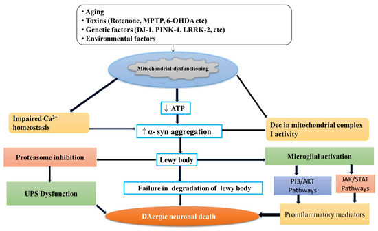 - Mani, S.; Sevanan, M.; Krishnamoorthy, A.; Sekar, S. A systematic review of molecular approaches that link mitochondrial dysfunction and neuroinflammation in Parkinson’s disease. Neurol. Sci. 2021, 42, 4459–4469. [Google Scholar] [CrossRef] [PubMed]
