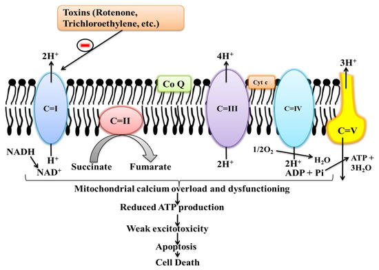 The mitochondrial function and calcium signaling are interlinked; the calcium (Ca2+) is the second messenger to transmit depolarization and synapses to the other neurons [74]. The concentration of Ca2+ in the cytosol stimulates the mitochondria to produce more energy. Ca2+ is maintained via the accumulation of Ca2+ in the mitochondrial matrix [75], leads to the activation of oxidative phosphorylation, and increases the production of ATP [74]. Environmental toxins such as rotenone and MPP+ reduce the level of Ca2+. The mitochondrial complex I deficiency power is not present in all patients with PD, either in the brain, platelets, or other tissues. The severity of the defect is about a 35% reduction in activity when the patient group is compared with control populations [76].