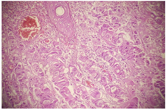 - Eguchi, T.; Basugi, A.; Kanai, I.; Miyata, Y.; Suzuki, T.; Hamada, Y. Adenosquamous carcinoma development as a recurrence of squamous cell carcinoma in the oral floor: A case report. Medicine 2019, 98, e17688. [Google Scholar] [CrossRef]
