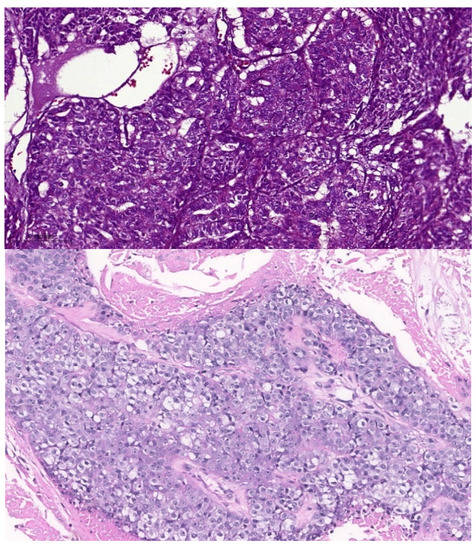 - Alos, L.; Castillo, M.; Nadal, A.; Caballero, M.; Mallofre, C.; Palacin, A.; Cardesa, A. Adenosquamous carcinoma of the head and neck: Criteria for diagnosis in a study of 12 cases. Histopathology 2004, 44, 570–579. [Google Scholar] [CrossRef] [PubMed]