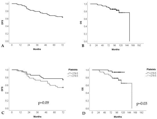 Table 2 shows the baseline characteristics of the patients according to the platelet count considering the outcome of relapse. Platelet values (×103/mm3) < 297 were observed in the lower clinical stages of T1 and T2 (50 and 38.1%) and N0 and N1 (57.1 and 35.7%). Approximately 70% of patients who did not relapse and did not die had platelet counts <297, while 57.7% and 69.2% of those who relapsed and died, respectively, showed platelet counts >297. A higher absolute cell count of leukocytes (p = 0.01), neutrophils (p = 0.01), and monocytes (p = 0.02) were associated with platelets >297 × 103/mm3. Lower DFS was associated with a higher platelet number (54 months at >297 vs. 60.9 months at <297).