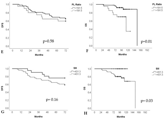 Kaplan–Meier curves from DFS and OS in LBC, according to the platelet count (×103/mm3), RPL, and SII, are shown in Figure 1. For all LBC patients, the DFS at 6 years was 58.13 ± 2.5 months (95%CI: 53.22–63.05) and the OS was 137.08 ± 5.02 months (95%CI: 127, 23–146.93). The platelet count showed an OS of 121.67 (95%CI: 117.30–126.04) and 127.21 (95% CI: 111.75–142.68) months for values <279 and >279 × 103/mm3, respectively (p = 0.03). The DFS, for platelets >279 and <279 × 103/mm3, was 54.73 (95%CI: 47.61–61.85) and 61.73 (95%CI: 55.21–68.26) months, respectively (p = 0.09). Likewise, a longer average survival (145.53 months—95%CI: 136.94–154.12) is observed when the PLR < 191.5 (vs. 101.26 months—95%CI: 85.36–117.11 for PLR > 191.5) (p = 0.01). Patients with SII < 431.3 had an OS of 130.37 months (95%CI: 117.40–143.33). There was no death for patients with SII > 431.31, and it was not possible to compare.