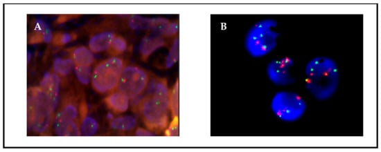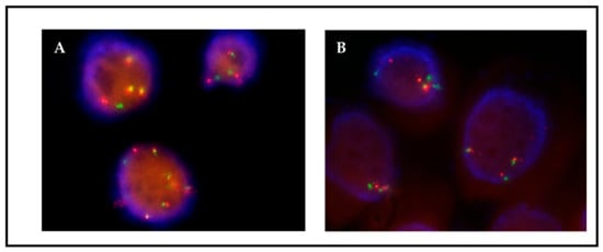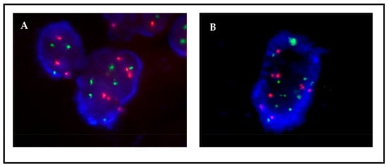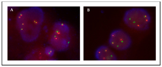 A protocol for fast, efficient FISH analysis in smears of cultured cells was developed based on the methodology usually employed for hematological samples [20]. It involved trypsinization of the cultures, fixation with carcinoid, extension on slides of a small number of cells (<1000), and staining with a standard FISH protocol. All primary cultures were successfully analyzed using this method. The turnaround time was 24 h; the quality of the images was comparable or superior to those obtained from FFPE tissues, with less background due to tissue overlapping (Figure 1); and the smears could be easily evaluated by an expert pathologist.