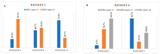 Monitoring of the variation through the different passages in cell populations carrying (A) MET CNGs and (B) FGFR1 CNGs.