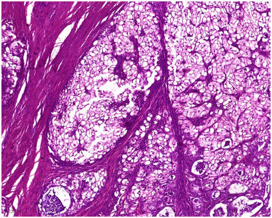 Conventional MEC was characterized by neoplastic squamous, mucinous, and intermediate components. The squamous component consisted of polygonal cells with eosinophilic cytoplasm and distinct cell borders, resembling squamous epithelial cells. The mucinous component comprised glandular structures filled with mucin-producing cells. The intermediate component consisted of cells with features between squamous and mucinous cells. These components varied in proportion within the tumor, leading to different histologic patterns. Clear cell MEC was characterized by the presence of clear cytoplasm within the tumor cells. The cytoplasm appeared optically clear due to the accumulation of glycogen or lipid droplets. This clear cell change was typically seen in the intermediate or mucus-secreting cells of MEC (Figure 1). Oncocytic MEC revealed a predominance of oncocytic cells within the tumor with granular eosinophilic cytoplasm. The oncocytic change involved both squamous and mucinous components of MEC. Warthin-like MEC exhibited histologic features reminiscent of Warthin tumor without abluminal oncocytic cells. The cystic spaces were filled with eosinophilic material resembling lymphoid stroma. These cystic spaces were surrounded by lymphoid tissue, with transition zones showing neoplastic and metaplastic squamoid and mucinous differentiation.