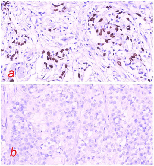 (a) ATF1-positive HCCC (magnification 40×), (b) ATF1-negative MEC (magnification 40×).