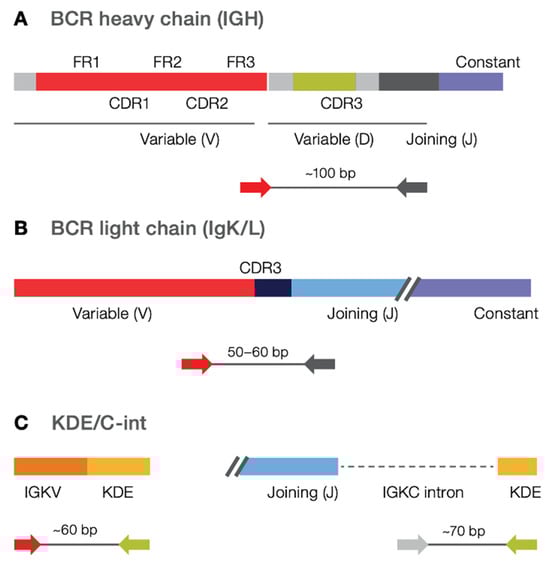 The Pan-Clonality Assay was used to sequence multiple BCR targets in a single reaction, using amplicons priming in the FR3 and J genes of (i) IGH rearrangements (amplifying an ~100 bp region) involving IGHV genes, (ii) IGK, IGL rearrangements (amplifying an ~50–60 bp region) involving IGKV and IGLV genes, respectively, as well as rearrangements containing (iii) Cint (C-intron; amplifying an ~60 bp region) and (iv) kappa-deletion element, or KDE (amplifying an ~70 bp region) (Figure 1). Each targeting primer set consists of multiple primers per V and J gene family that allows for degeneracy within each family to optimize clonotype detection in the presence of SHM at primer binding sites. Please note that IGKV-Kdel and IGK-KDE refer to the same type of rearrangement and are used interchangeably throughout the manuscript.