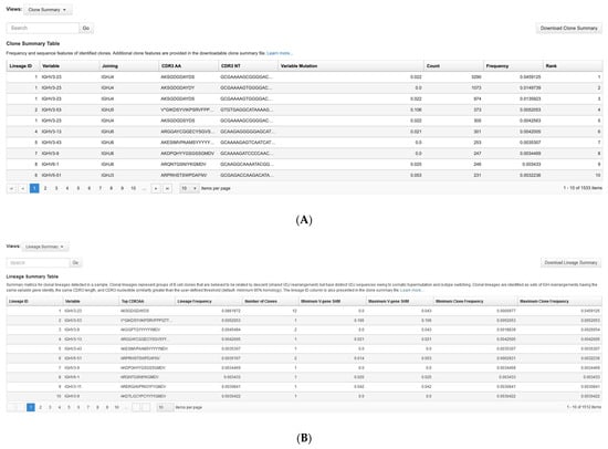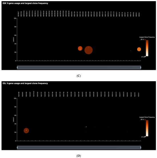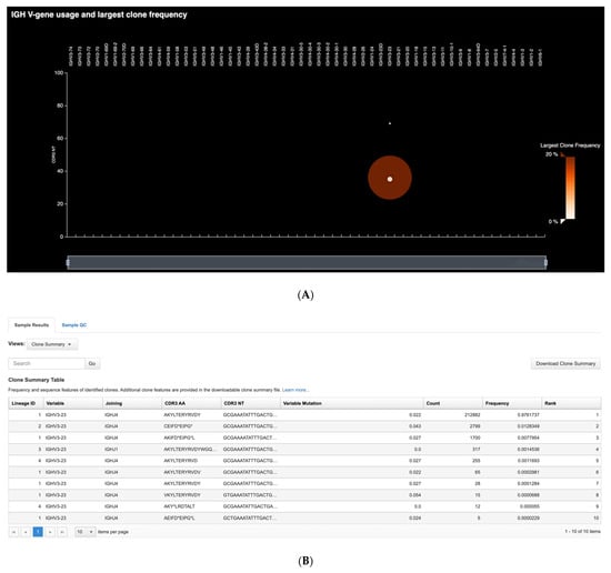 The software also quantified and reported several secondary and tertiary repertoire features in samples, such as Shannon diversity and evenness of the total population, as well as B-cell lineage groupings useful in identifying related sub-clones or clonotype lineages representing groups of B-cell clones believed to be related by descent (shared V(D)J rearrangement) but with distinct V(D)J sequences due to SHM. Clonotype lineages are identified as sets of IGH and IGK/L rearrangements having the same variable gene identity, the same CDR3 length, and CDR3 nucleotide similarity greater than the user-defined threshold (default: minimum 85% homology). Furthermore, the software includes spectratyping-format plots, wherein spectratyping refers to the clinical gold standard technique used historically for the analysis of immune repertoires. It plots the length distribution of unique CDR3 sequences detected in every V-gene locus across the entire repertoire. Reads for identified clones are arranged along the X-axis according to the variable gene identity and the Y-axis according to the CDR3 nucleotide length. The size of the circles indicates the frequency of a particular variable gene-CDR3 NT length combination within the dataset, while color indicates the frequency of the largest clone having a particular variable gene-CDR3 NT length combination. It enables easy visual identification of highly expanded or mutated clones in the samples.