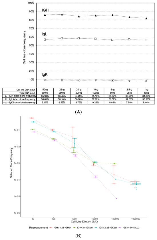 Pan-Clonality Assay clonotype detection across a range of low DNA inputs and limits of dilution. Stable detection of IGH, IGK and IGL clonal rearrangements is evident from the dot plots of clonal frequencies detected (y-axis) across a range of (A) cell line DNA inputs from 50 ng down to 1 ng (x-axis), and (B) serial cell line dilutions from 10−1 down to 10−6 (x-axis).