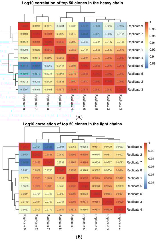 Ion Reporter multi-sample analysis of library replicates from a single PBL gDNA sample. Pearson’s correlation value of the top 50 clone frequencies across pairwise comparisons of 9 library replicates using, (A) the IGH workflow (Mean Pearson’s rho = 0.95) and (B) the IGKL workflow (Mean Pearson’s rho = 0.98) of the Pan-Clonality Assay.