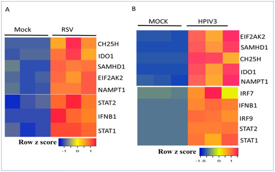 Regulation of the interferon-regulated metabolic gene signature and transcription factors by RSV and HPIV3 in A549 cells. (A) Human A549 lung cells mock-infected or infected with RSV for 24 h. (B) A549 cells mock-infected or infected with HPIV3 for 24 h. Data from 3 samples for each condition are shown. RNA levels were normalized by the DESeq2 method. Low and high gene expression are represented by blue and red, respectively.