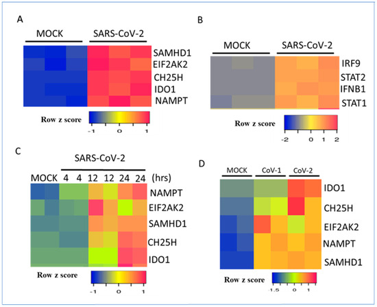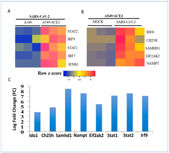 Most gene expression studies on SARS-CoV-2 were performed in well-established human lung epithelial cell lines such as Calu-3, A549, and NHBE. The basal expression of metabolic genes was very low in these cell lines. The infection of Calu-3 cells with SARS-CoV-2 dramatically induced the expression of the metabolic gene signature at the RNA level within 24 h. Mock-infected cells served as controls (Figure 2A). The induction of the metabolic gene signature was correlated with IFN-beta (IFNB1), STAT1, STAT2, and IRF9 at the RNA level (Figure 2B). A time-course analysis revealed that the metabolic gene signature was induced within 12–24 h after virus infection (Figure 2C). These results are consistent with the interpretation that IFN-β production by viral RNA recognition via the Toll-like receptor (TLR) pathway drives autocrine or paracrine IFN-β signaling involving the Jak–Stat pathway and the activation of interferon-stimulated gene expression [33,34]. SARS-CoV-2 was more effective in the induction of IDO1 and CH25H at the RNA level than SARS-CoV-1 in Calu-3 cells. In contrast, SAMHD1 and NAMPT were both induced to the same extent by both coronaviruses (Figure 2D). The productive infection of human lung epithelial cells by SARS-CoV-2 requires the cell membrane proteins ACE2 and TMPRSS2 to facilitate viral entry [46]. SARS-CoV-2 infection of A549 cells failed to induce IFNB1 and interferon-stimulated gene expression. The expression of ACE2 in A549 cells restored SARS-CoV-2-mediated induction of IFNB1, STAT1, STAT2, and IRF9 mRNA expression (Figure 3A,B). These studies revealed the important role of ACE2 in viral entry, activation of type I IFN signaling, and temporal regulation of interferon-stimulated transcription factors and the metabolic gene signature. Although cell culture models of respiratory virus infection provide important details on virus replication and the differential regulation of gene expression, they may not accurately reflect the host–pathogen interactions in vivo, where multiple immune and non-immune cell types in the lung interact in a complex manner. Mouse models of SARS-CoV-2 infection were recently developed to study host–pathogen interactions in vivo [47]. In an aerosol infection mouse model, SARS-CoV-2 induced the type I interferon-regulated transcription factors and metabolic gene signature, confirming the results in human lung epithelial cells (Figure 3C).