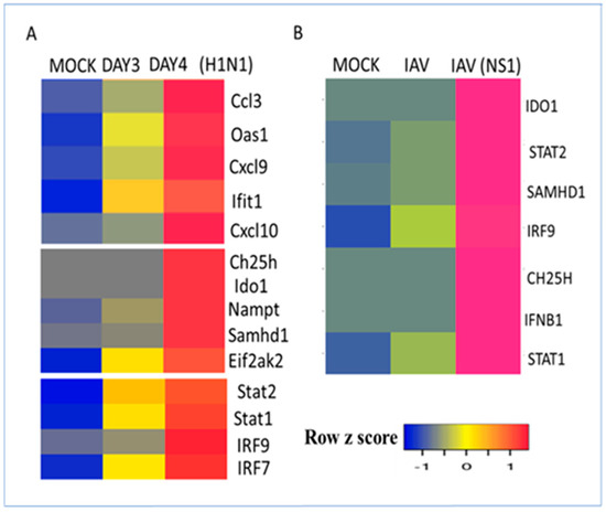 Influenza virus is a major respiratory pathogen that often causes significant mortality and morbidity, particularly among young children and geriatric patients [48]. Influenza is generally limited to the upper respiratory tract; however, when the lower respiratory tract becomes involved, significant lung damage is observed. This may occur with pandemic strains (such as the 1918 virus that killed more than 50 million worldwide) or pathogenic influenza strains (such as H1N1 and H5N1). Highly pathogenic strains of influenza, such as the reconstructed 1918 influenza virus (H1N1), induce a dramatic increase in inflammatory cytokines and an influx of neutrophils and macrophages, resulting in inflammation, tissue injury, and death in mice [32,49]. Infection of mice with the reconstructed 1918 influenza virus dramatically induced interferon-stimulated antiviral and inflammatory gene expression [49]. These genes include well-known antiviral interferon-stimulated genes (ISGs) such as oligoadenylate synthetase (Oas), guanylate-binding proteins (Gbps), interferon-induced protein with tetratricopeptide (Ifit), and immunoregulatory cytokines and chemokines induced 3 days after virus infection [32]. The metabolic enzyme gene signature was also induced 3 days after virus infection and was temporally correlated with the inducible expression of the transcription factors Stat1, Stat2, and Irf9 (Figure 4A). In contrast to the pandemic influenza virus, the seasonal non-pandemic strains of influenza inhibit type I interferon and inflammatory responses. In these strains, the virus encodes a non-structural protein (NS1) that is a potent inhibitor of interferon regulatory factor 3 (IRF3) and type I interferon production [50]. Furthermore, NS1 inhibits STAT1 activation, resulting in the attenuation of interferon-stimulated gene expression [51]. Induction of the metabolic gene signature in NHBE bronchial epithelial cells was abrogated by the wild-type influenza A virus (IAV). In contrast, IAV infection with a mutant virus containing a deletion of NS1 (IAVNS1) resulted in the induction of the metabolic gene signature in NHBE cells (Figure 4B). This induction was correlated with the induction of IFN-beta (IFNB1) and interferon-inducible transcription factors STAT1, STAT2, and IRF7 (Figure 4B). These studies suggest that multiple factors, such as virus strains, host-encoded factors, virus-encoded factors, and cell type may play an important role in determining viral pathogenesis.