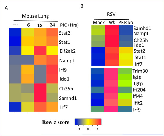 Regulation of the interferon-regulated metabolic gene signature and transcription factors by double-stranded RNA and protein kinase R (PKR/EIF2AK2) in mice. Mock treatment was indicated by (---) (A) Mice treated with double-stranded RNA mimetic poly I:C for 6, 18, or 24 h. (B) Wild-type or PKR-KO mice were mock-infected or infected with RSV for 24 h. RNA expression values were normalized by the DEseq2 method and are shown as a heatmap. Data from two samples for each condition are shown.