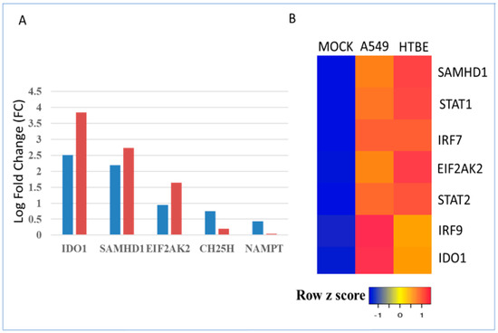 Type I interferons (IFNs) are pluripotent cytokines that play a major role in the host immune response to respiratory viruses, including Respiratory Syncytial Virus (RSV), influenza, and coronaviruses (e.g., SARS-CoV-2), by regulating several hundred genes involved in antiviral defense, immune modulation, and cell growth [1,2]. SARS-CoV-2 infection and the resulting severe coronavirus disease 19 (COVID-19) have caused millions of deaths worldwide [3,4]. A variety of high-throughput studies in the last 3 years have provided novel insights into respiratory virus–host interactions, including gene signatures for antiviral defense, cytokine and chemokine responses, and signal transduction pathways, and the identification of potential drug targets [5,6,7,8,9,10]. Gene expression profiling by microarrays and RNA-seq enabled the global monitoring of cell-, tissue-, and disease-specific gene expression signatures in human lung cells in response to SARS-CoV-2 and in COVID-19 patients through the simultaneous quantitative analysis of differential expression levels of thousands of genes on a single platform [5,6,9,10]. Multiplex antibody assays provided important information on the temporal activation of cytokine levels, including type I and type II interferons (IFN), tumor necrosis factor-alpha (TNF-α), interleukin-1 beta 1(IL-1β), and interleukin 6 (IL-6) in the bronchoalveolar lavage fluid (BALF) of COVID-19 patients [11]. Multilevel proteomics revealed the function of SARS-CoV-2-encoded viral proteins and their interactions with the host genome and global alterations in signaling such as transforming growth factor-beta (TGF-β) and autophagy signaling in A549 human lung adenocarcinoma cells reconstituted with viral entry receptor ACE2 [12]. Metabolic studies revealed high levels of the tryptophan catabolic product kynurenine in the serum of COVID-19 patients [13,14]. Tryptophan is an essential amino acid for cell survival, and the intracellular enzyme that breaks down tryptophan to kynurenine is known as indoleamine-3,5-dioxygenase or IDO1 [15]. Furthermore, elevated levels of cholesterol-25-hydroxylase (CH25H), which is involved in cholesterol metabolism, have been reported in serum samples of COVID-19 patients [13]. Modulating cell metabolism to their advantage is a key tactic of respiratory viruses in their interactions with the host [16,17]. Macromolecules such as nucleotides, carbohydrates, proteins, and fats play major structural and functional roles in cell metabolism and are essential for viral replication and multiplication. Among these macromolecules, proteins composed of amino acids are the most diverse in terms of functions, such as enzyme activities that accelerate metabolic processes and hormones and neurochemicals, which are substances that deliver signals within the body to regulate cell metabolism. Many enzymes involved in gene regulation require vitamins and co-factors such as those generated during metabolism, demonstrating a direct link between metabolism and gene expression [18]. The transcriptional induction of host catabolic enzymes by interferon depletes the essential components of cell survival, such as amino acid, lipid, nucleotide, and polyamine reserves, to limit respiratory virus proliferation [19]. Metabolic reprogramming by type I interferons in response to respiratory virus infection includes increasing the uptake of amino acids and promoting the synthesis of amino acid-derived metabolites, such as polyamines, coenzymes, and nitric oxide, in different cell types [17,19]. Polyamines are essential for cell proliferation and differentiation, whereas nitric oxide is a signaling molecule with various immunoregulatory and antiviral functions [20]. Respiratory virus infection induces glycolysis and inhibits type I interferon production and the antiviral response in plasmacytoid dendritic cells [21]. Another important metabolic effect of IFNs is the regulation of fatty acid metabolism and oxidative phosphorylation [22]. The availability of multiple GEO datasets of human lung epithelial cells infected with several respiratory viruses as well as mouse models of respiratory virus infection has led to the identification of differentially expressed genes (DEGs) or gene signatures [5,6,23,24,25,26,27,28,29]. Bioinformatic analyses of lung gene expression datasets from cell culture and mouse models of respiratory virus infection revealed the induced expression of five key enzymes involved in macromolecule metabolism. Respiratory viruses induce an IFN-regulated metabolic gene signature that includes cholesterol-25-hydroxylase (CH25H), nicotinamide phosphoribosyltransferase (NAMPT), eukaryotic translation initiation factor 2 alpha kinase 2 (EIF2AK2), sterile alpha motif and histidine/aspartic acid domain-containing protein (SAMHD1), and indoleamine-3,5-dioxygenase (IDO1) at the RNA level in human lung epithelial cells. These metabolic enzymes are involved in the feedback regulation of type I interferon signaling. Furthermore, this novel interferon-regulated metabolic gene signature was also activated in response to bacterial lipopolysaccharide (LPS), and it also interacts with proteins involved in the unfolded protein response (UPR) activated specifically by SARS-CoV-2 infection in lung epithelial cells [29]. In this study, the regulation of metabolic gene signatures in human lung epithelial cells and in mouse models in response to respiratory viruses and type I interferon signaling was investigated.