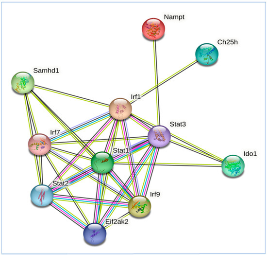 Protein interactions mediate post-translational modifications such as phosphorylation and ubiquitination that activate or inhibit signaling and provide novel insights into biological functions [37]. Protein interactions play a critical role in all aspects of type I IFN signaling, including the interactions between type I interferons and their receptors, activation of the Jak–STAT pathway, and interaction between STAT proteins and other transcription factors to regulate ISG expression [28]. These interactions can be visualized as a graph using the information in several bioinformatic databases such as BIOGRID and STRING [37]. The protein interactions of the genes in the metabolic gene signature were interrogated in the STRING database, which revealed that SAMHD1, EIF2AK2, and IDO1 extensively interact with multiple major hubs in the antiviral subnetwork such as STAT1, STAT3, IRF7, and IRF1. In contrast, NAMPT and CH25H interact specifically with STAT3 and IRF1, respectively (Figure 7). These interactions may play a major role in the regulation of interferon signaling in response to multiple respiratory viruses [55]. In addition, IDO1 also interacts with suppressors of cytokine signaling 1 (SOCS1) and suppressors of cytokine signaling 3 (SOCS3) proteins, which are involved in the negative regulation of cytokine signaling. Respiratory viruses can also interfere with protein interactions that regulate interferon-mediated gene expression. For example, the influenza virus NS1 protein can bind to STAT1 and inhibit its transcriptional activity. This prevents the expression of ISGs and allows the virus to replicate more efficiently [50,51]. The development of therapeutic strategies to target protein interactions that regulate gene expression in response to respiratory viruses is a promising area of research [53,56].