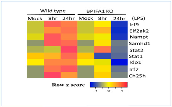 LPS regulation of the interferon-stimulated metabolic gene signature and transcription factors in wild-type and BPIFA1-knockout (KO) mice. Wild-type or BPIFA1-KO mice were mock-treated or treated with LPS for 8 or 24 h. RNA expression values were normalized and are shown as a heatmap.