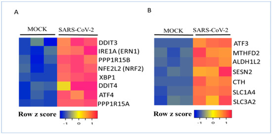 Regulation of the unfolded protein response (UPR) and IDO1 target genes by SARS-CoV-2 in Calu-3 human lung cells. (A) Calu-3 cells were mock-infected or infected with SARS-CoV-2 for 24 h. UPR target gene expressions are shown. (B) Calu-3 cells were mock-infected or infected with SARS-CoV-2 for 24 h. IDO1 target gene expression is shown. RNA expression values were normalized and are shown as a heatmap.