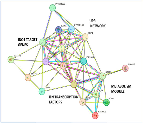 Visualization of the protein–protein interaction (PPI) network of the metabolic gene signature with the unfolded protein response (UPR), type I interferon signaling, and IDO1 target genes. Protein interactions in the signaling network were obtained from the STRING database. Interacting proteins are indicated by ovals and protein interactions are indicated by edges.