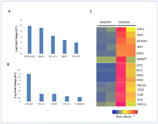 SARS-CoV-2 infection can cause various metabolic alterations in patients, both during acute infection and in the long term. These alterations can affect all aspects of metabolism, including glucose metabolism, lipid metabolism, amino acid metabolism, and energy metabolism [68,69]. Some of the most common metabolic changes observed in COVID-19 patients include hyperglycemia, increased triglycerides, increased levels of aromatic amino acids such as tryptophan and tyrosine, and decreased levels of arginine leading to defects in immune function and wound healing as well as muscle wasting [68,69,70]. Interrogation of the gene expression datasets of healthy and COVID-19 patients revealed that metabolic markers such as EIF2AK2 and IDO1 were upregulated in the lung tissue samples of COVID-19 patients compared with those of healthy patients. This upregulation was also correlated with an increase in interferon-inducible transcription factors such as STAT1, STAT2, and IRF7 in the lung tissue samples of COVID-19 patients (Figure 11A). In contrast, the metabolic markers CH25H and SAMHD1, and inducible transcription factors STAT1, STAT2, and IRF8 were significantly increased in the peripheral blood (PBMC) samples of COVID-19 patients compared with those of healthy individuals (Figure 11B). A transcriptomic analysis of a different dataset revealed that the interferon-induced transcription factors STAT1, STAT2, and IRF7 and the metabolic gene signature genes EIF2AK2, IDO1, and NAMPT were significantly upregulated in the lung tissue samples of COVID-19 patients compared with those of healthy patients (Figure 11C). The innate immune response to SARS-CoV-2 infection must be precisely controlled, and any imbalance in the cytokine response may result in lung injury and death [5,6,8,10]. A mix of antiviral proteins, proinflammatory cytokines such as IL-α, and IL-1β, and chemokines such as CXCL10, CXCL11, and CCL8 were upregulated in the lung tissue samples of COVID-19 patients compared with those of healthy controls (Figure 11C).