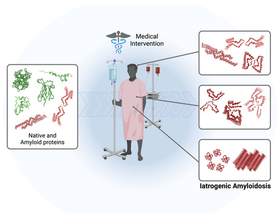 While primary amyloidosis, associated with the generation or overproduction of a specific amyloidogenic protein in a specific disease, has been extensively studied, the subcategory known as iatrogenic amyloidosis remains relatively enigmatic. Iatrogenic amyloidosis is a rare and distinct form of amyloidosis that emerges as an unintended consequence of medical interventions, therapeutic procedures, or drug treatments, often unrelated to underlying amyloidogenic processes (Figure 1). It has been observed primarily in patients exposed to infectious prion proteins (iatrogenic Creutzfeldt–Jakob disease), long-term dialysis patients, and recipients of “domino” transplants [11,12,13,14,15]. This condition has remained relatively obscure due to its infrequency and intricate nature; however, as new and unique cases come to light [7], there is a growing need for a deeper comprehension of its pathogenic mechanisms, alongside more precise diagnostic techniques and therapeutic interventions in its management.