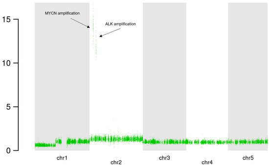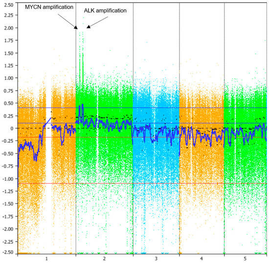 Single nucleotide variants (SNVs) were identified using paired tumor-normal samples by Mutect2 from GATK 4.1 [48] and pathogenicity was predicted by variant effect predictor (VEP) (version 92) [49]. Somatic copy number alterations (CNAs) were identified with the GATK4 pipeline using an in-house generated panel of normals (PON) from normal samples prepared and sequenced under the same conditions and used this for normalization. The allelic imbalance ratios were calculated using 1000 genomes, autosomal SNP sites with a minor allele frequency (MAF) > 0.1. One of the authors (R.S.B.) analyzed the data for CNV in all chromosomes, with the exception of the two sex chromosomes (X and Y). Specific attention was paid to chromosome arm 2p, which contains the MYCN and ALK gene, to check for amplifications of one or both genes (Figure 4). The results of the analyses were independently checked by an experienced molecular biologist (L.A.K.).
