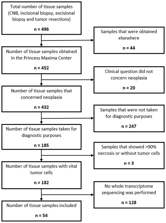 Pathological and molecular data from patients diagnosed with a neuroblastoma in the Princess Máxima Center (PMC) between November 2014 and December 2021 were retrospectively collected. The requirement to obtain informed consent was waived by the Medical Ethical Committee, based on the Dutch Medical Research with Human Subjects Law. Data collection included core needle biopsies, excisional biopsies, incisional biopsies and resections. Tumors were classified according to the International Neuroblastoma Pathology Classification (INPC). Exclusion criteria were no whole transcriptome sequencing was performed on the sample, samples were not taken for diagnostic purposes, samples were obtained elsewhere, the clinical question did not concern neoplasia (e.g., clinical question concerned a possible graft versus host reaction), non-diagnostic samples, bone marrow biopsies, fine needle aspirates, autopsy samples, samples that showed >90% necrosis or samples without tumor cells. This yielded a total of 54 diagnostic samples. Clinicopathological data were obtained from clinical medical records, pathology reports and radiology reports. This included age at diagnosis, sex, OS, EFS, tumor location, type of material, clinical question and tumor classification using the INPC. OS was based on last contact with patients or their parents. EFS was based on the latest imaging performed (ultrasound, CT-scan or MRI). An event was defined as progression or relapse of the tumor, secondary malignancy or death. Tumor classification was determined by experienced pathologists working in the PMC. The tumors were categorized into two groups: group A = undifferentiated, poorly differentiated neuroblastoma and neuroblastoma not further specified and group B = differentiated neuroblastoma, ganglioneuroblastoma and ganglioneuroma.