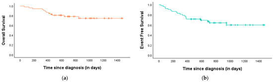 In the whole cohort, the OS was 75% (SE 6.6) and the EFS was 63% (SE 7.6) since diagnosis (Figure 6). The median follow-up time for OS was 846 days (95% CI (630.764–1061.236)). Five patients died because of resistant disease, five patients experienced a relapse and treatment-related toxicity was the cause of death for three patients. Median follow up time for EFS was 866 days (95% CI (648.195–1084.805)). The most frequent first event was a relapse (n = 9), followed by progression (n = 7) and death (n = 4).