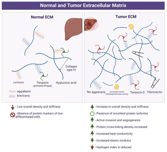 Extracellular matrix in normal tissue and tumor (oncomatrix). Created with Biorender.com.