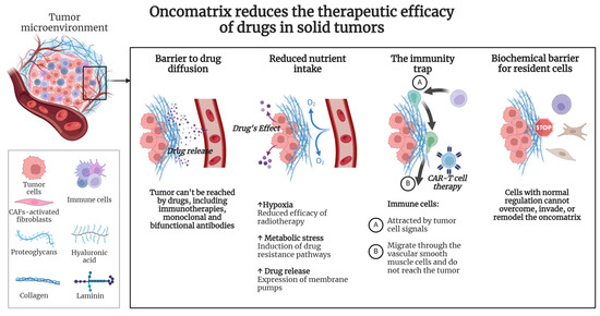 The reduction in tumor sensitivity to drug therapy may be due, in part, to barriers to immune cell infiltration that depend on the properties of the tumor matrix (oncomatrix) [82]. For example, the increased density of the oncomatrix induced by chemotherapy compared to normal tissue may reduce the diffusion of drugs from the bloodstream, thereby decreasing tumor sensitivity to drug therapy. This phenomenon may serve as a compensatory mechanism to increase tumor resistance to treatment [132,133].