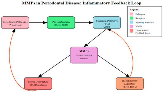 Pattern recognition receptor (PRR) signaling pathways in periodontal disease. Note: The diagram illustrates the key molecular interactions in periodontal inflammation, from pathogen recognition to inflammatory outcomes. PRRs (green) including TLR2, TLR4, NOD1/2, and NLRP3 recognize periodontal pathogens (red) and initiate signaling cascades through adaptor molecules (blue). This leads to the activation of transcription factors (orange) and subsequent production of inflammatory mediators (purple). The dashed red line indicates the MMP-mediated inflammatory feedback loop. Arrows indicate the direction of signaling pathways.