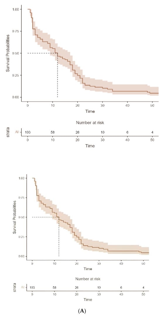 Of the 104 total of patients, only 7 (6.7%) were still alive by the end of the study, while the other 96 patients (93.2%) either died or were missed in the follow up, and the overall median survival was 12 months (IQR: 16.5 months) [Figure 1A].