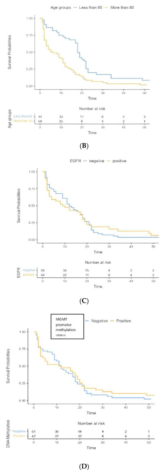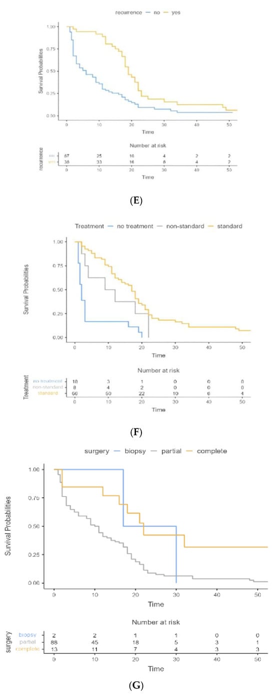 Kaplan–Meier survival estimates: (A) Overall survival, (B) Age groups, (C) EGFR alterations, (D) MGMT promoter methylation status, (E) Recurrence, (F) chemoradiotherapy treatment, (G) Surgery.