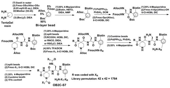 The OB2C library was constructed using a bi-layer bead system based on TentaGel resin [13]. Each bead displayed biotin and a benzimidazole-based compound, with a tripeptide coding tag embedded inside to prevent interference with the screening process. The synthesis started by swelling TentaGel resin, followed by coupling Alloc-protected Fmoc amino acids and biotin using HBTU-mediated reactions. The beads were split and functionalized with 42 different carboxylic acids, isocyanates, or acyl sulfonyl chlorides to generate the first chemical diversity (R group). A second round of splitting and coupling introduced 42 l-/d-amino acids (X1 group) to add further diversity. The resulting OB2C library contained 1764 unique compounds displayed on the bead surface for high-throughput screening.