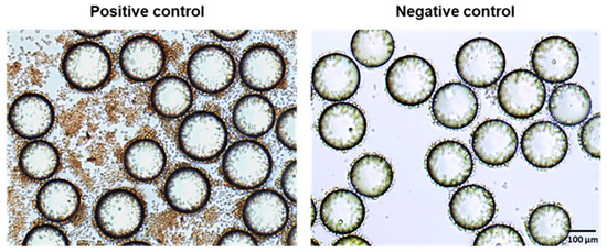First, neutravidin (5 nmol) was reacted with LLP2A-biotin at a 1:2 molar ratio for 20 min. The OB2C beads were then adhered to a 12-well culture plate using 80% dimethylformamide. The mixture of neutravidin and LLP2A-biotin was added to the wells containing the beads. After 20 min of incubation, Jurkat cells (5 × 105) were seeded into the wells and incubated at 37 °C for 20 min. Positive controls involved LLP2A beads incubated with Jurkat cells stimulated using a cell stimulation cocktail (eBioscience, San Diego, CA, USA) containing 50 ng/mL PMA and 1.35 µM ionomycin) in the presence of 5 μg/mL Brefeldin A (eBioscience), while negative controls involved LLP2A beads incubated with Jurkat cells without stimulation. The activation cocktail stimulated protein kinase C (PKC) and increased intracellular calcium, promoting IFN-γ production. Brefeldin A was included during the incubation to block protein transport and prevent cytokine secretion, enhancing intracellular detection. Unbound cells were gently washed off using PBS, and the cell-bound beads were incubated at 37 °C for an additional 24 h. Following the incubation, the cells were fixed with 4% paraformaldehyde for 20 min. For the ICC assay, nonspecific protein binding was blocked by adding 5% BSA, and the cell membrane was permeabilized using 0.5% Triton X-100. Rabbit anti-human IFN-γ (Cell Signaling Technology, Danvers, MA, USA) was used as the primary antibody at a 1:100 dilution in PBS, and the beads were incubated with the primary antibody overnight at 4 °C. After washing with PBS, the beads were incubated with the secondary antibody, a horseradish peroxidase (HRP)-conjugated goat anti-rabbit IgG, for 1 h at room temperature. HRP activity was detected using diaminobenzidine tetrahydrochloride as a substrate for 3 min, according to the manufacturer’s instructions (BioGenex, Fremont, CA, USA). In addition, the significant difference in cell numbers between the positive and negative controls can be attributed to PMA-induced α4β1 integrin expression, which enhances Jurkat cell adhesion and retention during washing in the positive control. In contrast, the absence of PMA in the negative control results in weaker adhesion and greater cell loss during washing, leading to lower cell numbers and reduced IFN-γ detection.