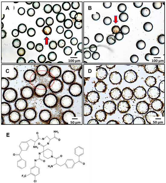LLP2A was incorporated into the OB2C libraries as a cell-capturing ligand for Jurkat cells, due to its high affinity for α4β1 integrin, which is commonly activated in malignant lymphoid cells [15]. LLP2A facilitated the attachment of suspension cells to the bead surface, enabling an interaction between the displayed small molecules on the beads and the cell surface receptors. This setup was designed to test the hypothesis that random compounds might activate immune responses by interacting with receptors like Toll-like receptors. Brefeldin A was used to block protein transport during activation, enhancing intracellular cytokine staining and aiding in the detection of immune responses. Beads displaying compounds that induced IFN-γ production were identified by brown-stained cells, indicating positive immunomodulatory activity. In Figure 3A,B, red arrows indicate two positive beads that triggered IFN-γ expression, as demonstrated by the brown staining of the attached Jurkat cells. These beads correspond to the Kib-IM-1 and Kib-IM-4 compounds, which were identified from a 1764-compound OB2C library. Beads were resynthesized with Kib-IM-1 and Kib-IM-4 for validation, as shown in Figure 3C,D. The brown-stained cells indicate successful IFN-γ production, confirming the immunomodulatory effect of these compounds. In Figure 3C, non-bead-associated cells do not produce IFN-γ, as they are not exposed to the small molecules synthesized on the beads, highlighting the essential role of bead-associated molecules in IFN-γ production.This comparison underscores the selective immunomodulatory activity of Kib-IM-1 and Kib-IM-4, aligning with the initial screening results. The structure of Kib-IM-4 is shown in Figure 3E.