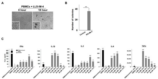 Microscopy (Olympus, Center Valley, PA, USA) was used to assess PBMC clustering as an indicator of immune activation after treatment with Kib-IM-4. PBMCs were treated with soluble Kib-IM-4 at 10 µM and incubated for 72 h. The formation of cell clusters was visualized and documented as evidence of immune cell activation. Three days after treatment, colonies were imaged for size measurement, and those with diameters exceeding 40 µm were counted from three separate wells.
